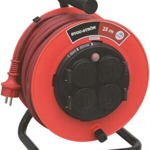 230V. 1-fas. 25m. 3G1,5mm2. Meget slitesterk kabeltrommel i metall. Overopphetingsvern og jordete uttak med lokk. Anti-twist. Godkjent for utendørs bruk. IP44.
