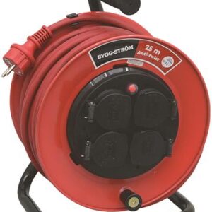 230V. 1-fas. 25m. 3G1,5mm2. Solid kabeltrommel i slagfast plast. Overopphetingsvern og jordete uttak med lokk. Anti-twist. Godkjent for utendørs bruk. IP44.
