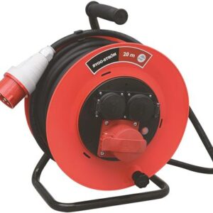 230V. 16A. 3-fas. 20m. 5G2,5mm2.Kraftig kabeltrommel i slagfast plast. Overopphetingsvern og uttak type 416-6 og Schuko med lokk. Godkjent for utendørs bruk. IP44.