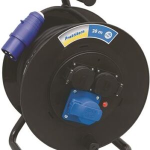 230V. 1-fas. 20m. 3G2,5m2. Solid kabeltrommel i slagfast plast. Overopphetingsvern, CEE uttak og jordete Schuko uttak. Godkjent for utendørs bruk. IP44.