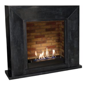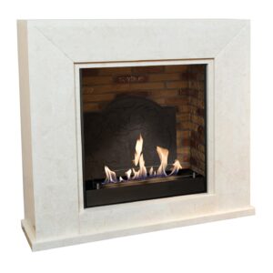 H100 x B130 x D35cm + D12cm. Frittstående biopeis i rustikk design. Farge peis polert offwhite og grå sten. Innsats grå murstein. Type 5820LB.