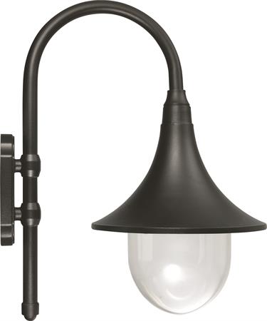 H45 x D37,5cm. Populær vegglampe i moderne design. Epoxylakkert presstøpt aluminium. Sokkel E27. Farge sort lampe, kuppel i klart glass. IP33.