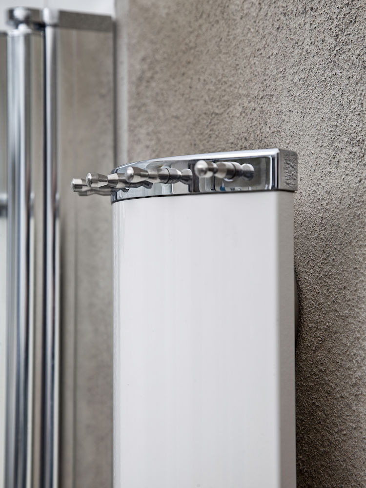 Håndkle-/klestørker som passer overalt i huset. Unik design, buet profil, børstet aluminium. Farge sølv. 5 års garanti. IP44.