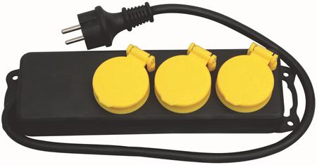 230V. 1-fas. 0,5m. 3G1,5mm2. 3-veis forgrener SK10 med jord. Selvlukkende lokk. Godkjent for utendørs bruk. IP44.
