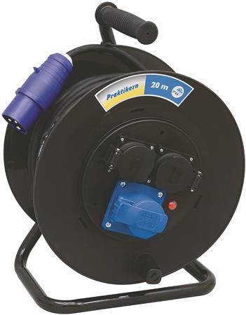230V. 1-fas. 20m. 3G2,5m2. Solid kabeltrommel i slagfast plast. Overopphetingsvern, CEE uttak og jordete Schuko uttak. Godkjent for utendørs bruk. IP44.
