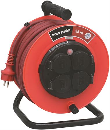 230V. 1-fas. 25m. 3G1,5mm2. Solid kabeltrommel i slagfast plast. Overopphetingsvern og jordete uttak med lokk. Anti-twist. Godkjent for utendørs bruk. IP44.