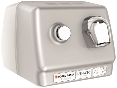 Vegghengt, vandalsikker hårføner. Tåler mange brukere pr dag. 1 lufthastighet. Varm luft 1 temperatur. Farge børstet stål. IPX1.