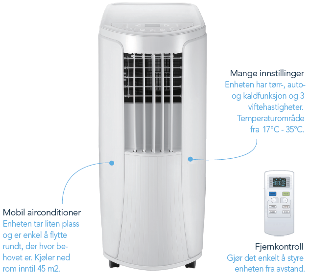 Hjul og håndtak. Ingen installasjon. Vedlikeholdsfri. Auto-, tørr- og kaldfunksjon. 3 viftehastigheter. Passer for rom opp til 45m2.