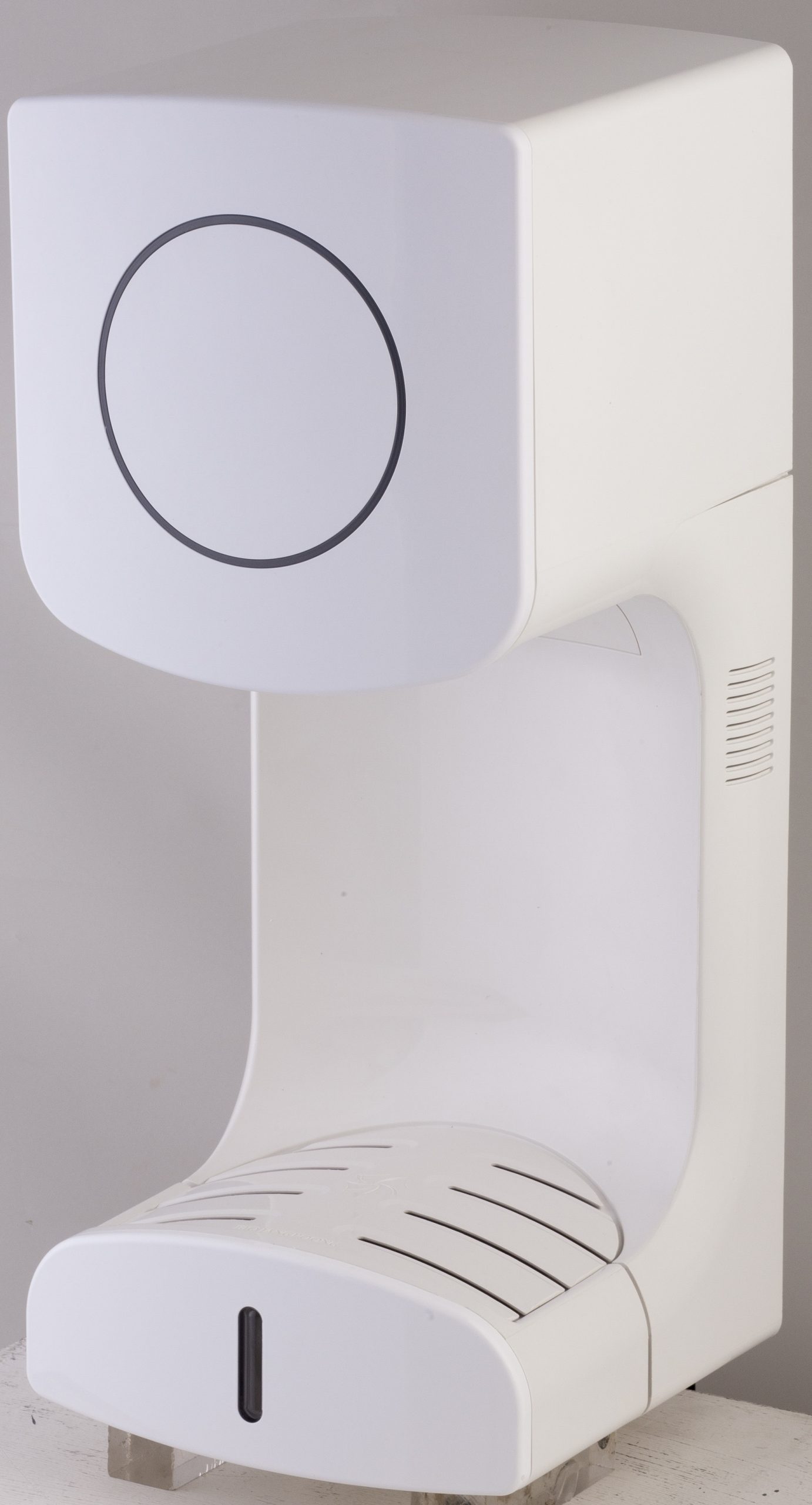 Designriktig håndtørker med slow start. Hastighetsreg. og 3-trinns filtreringssystem. Tørker hendene på 15 sek. Vandalsikker. IPX1.