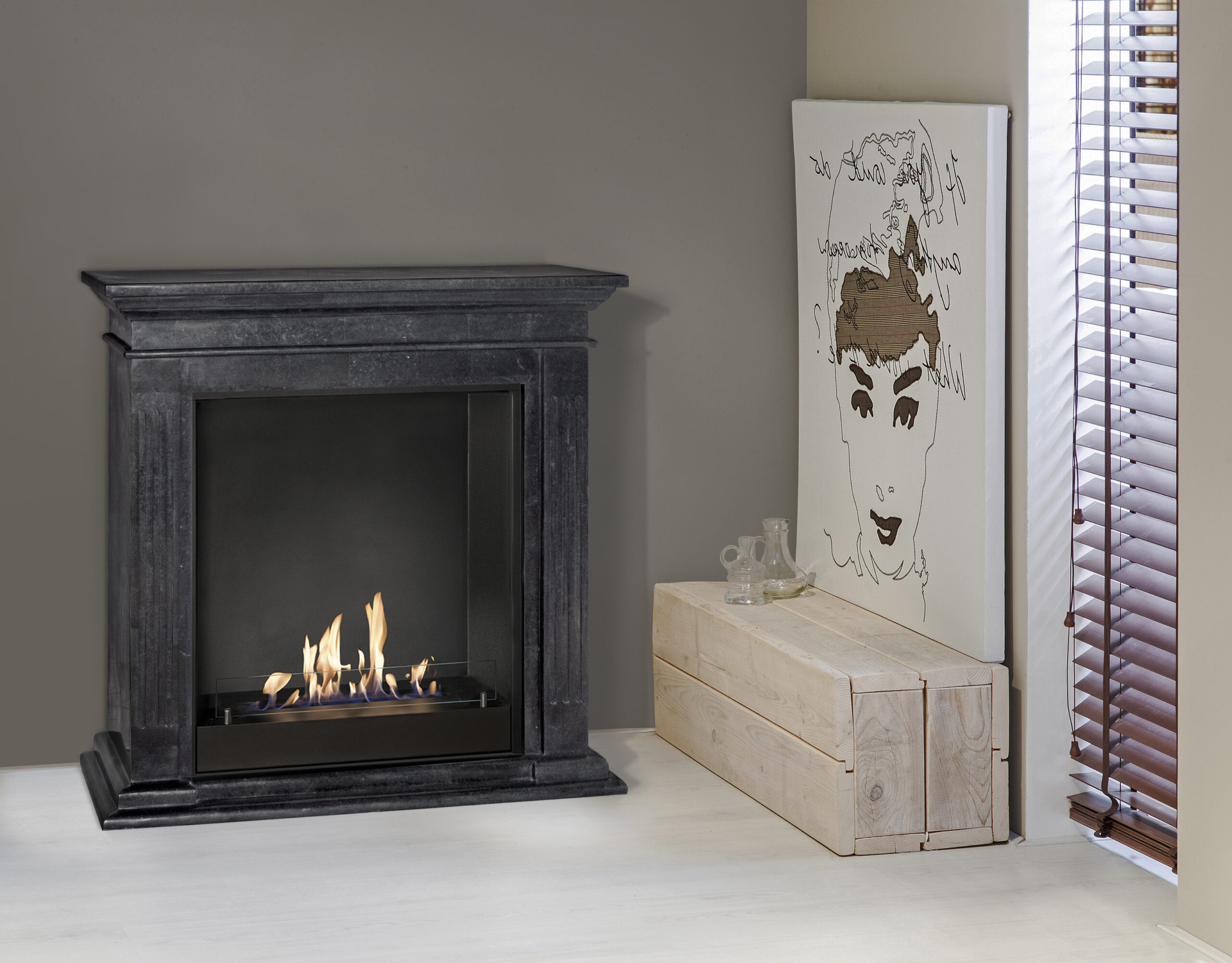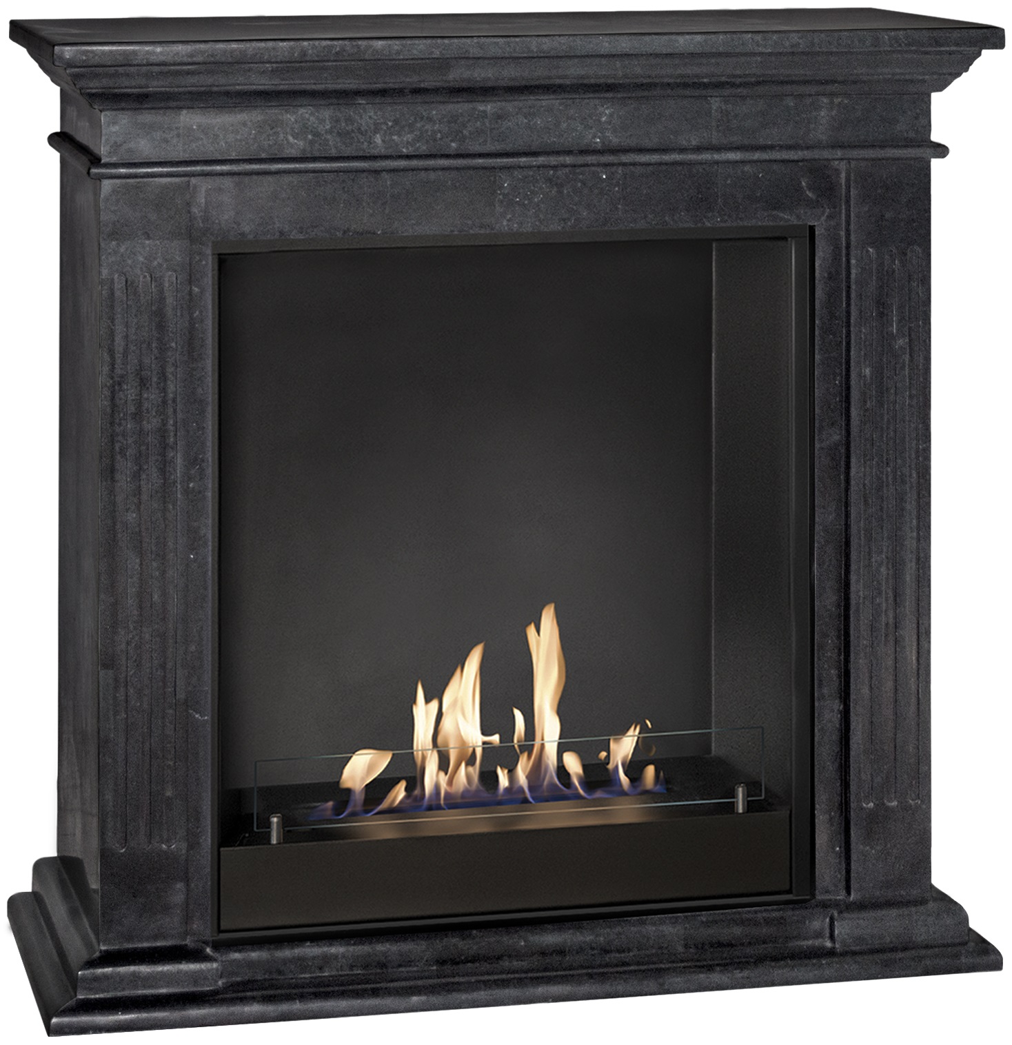 H94,8 x B98 x D37,5cm. Frittstående biopeis med rene linjer. Føydal utsmykking. Farge peis polert sort sten. Innsats sort. Type 5820B.