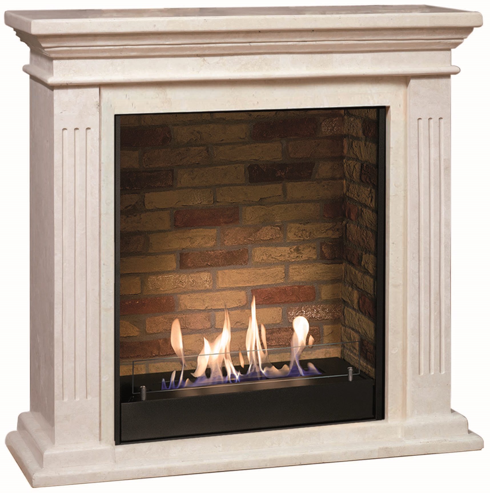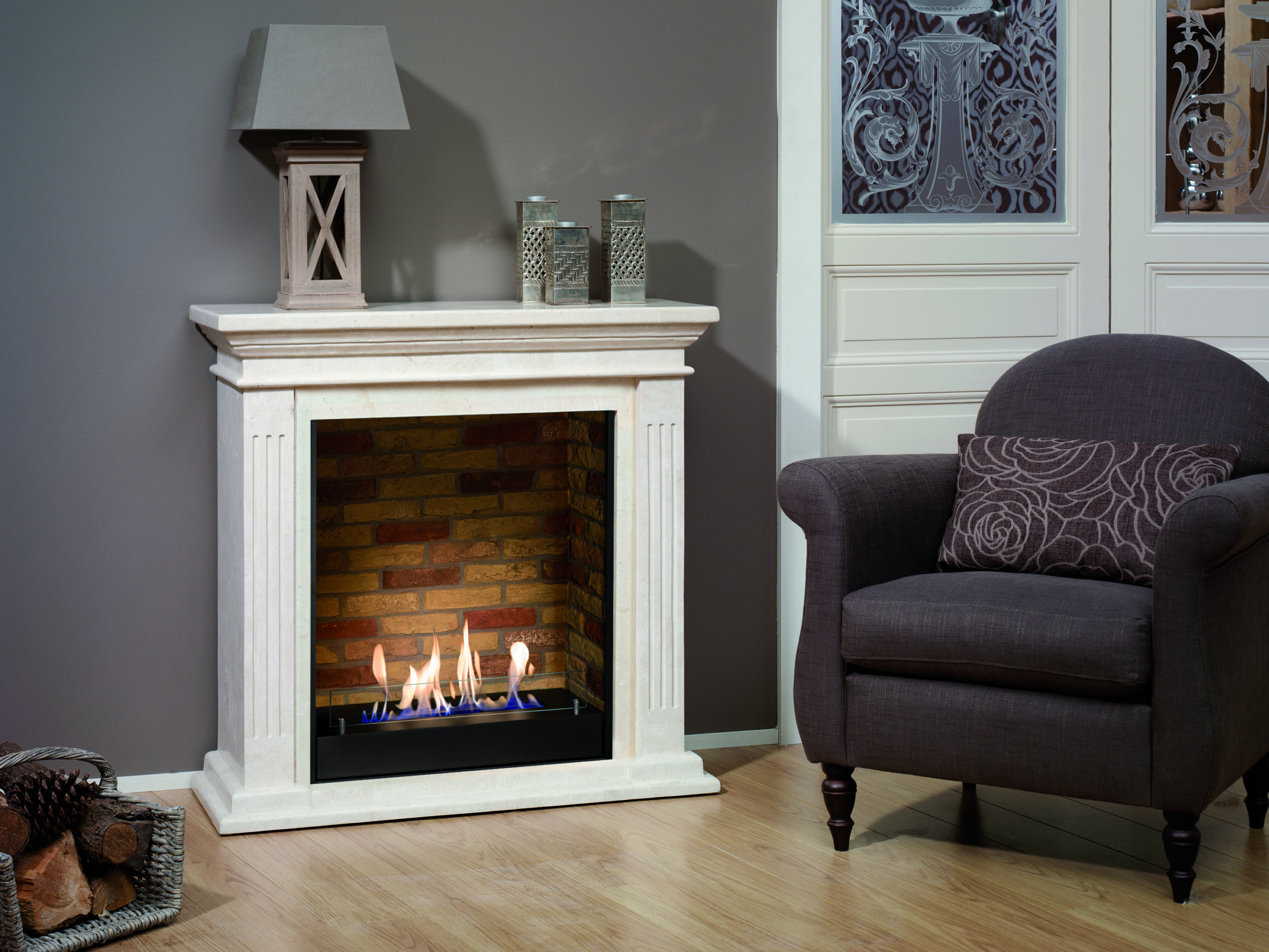 H94,8 x B98 x D37,5cm. Frittstående biopeis med rene linjer. Føydal utsmykking. Farge peis polert offwhite sten. Innsats murstein. Type 5820BM.