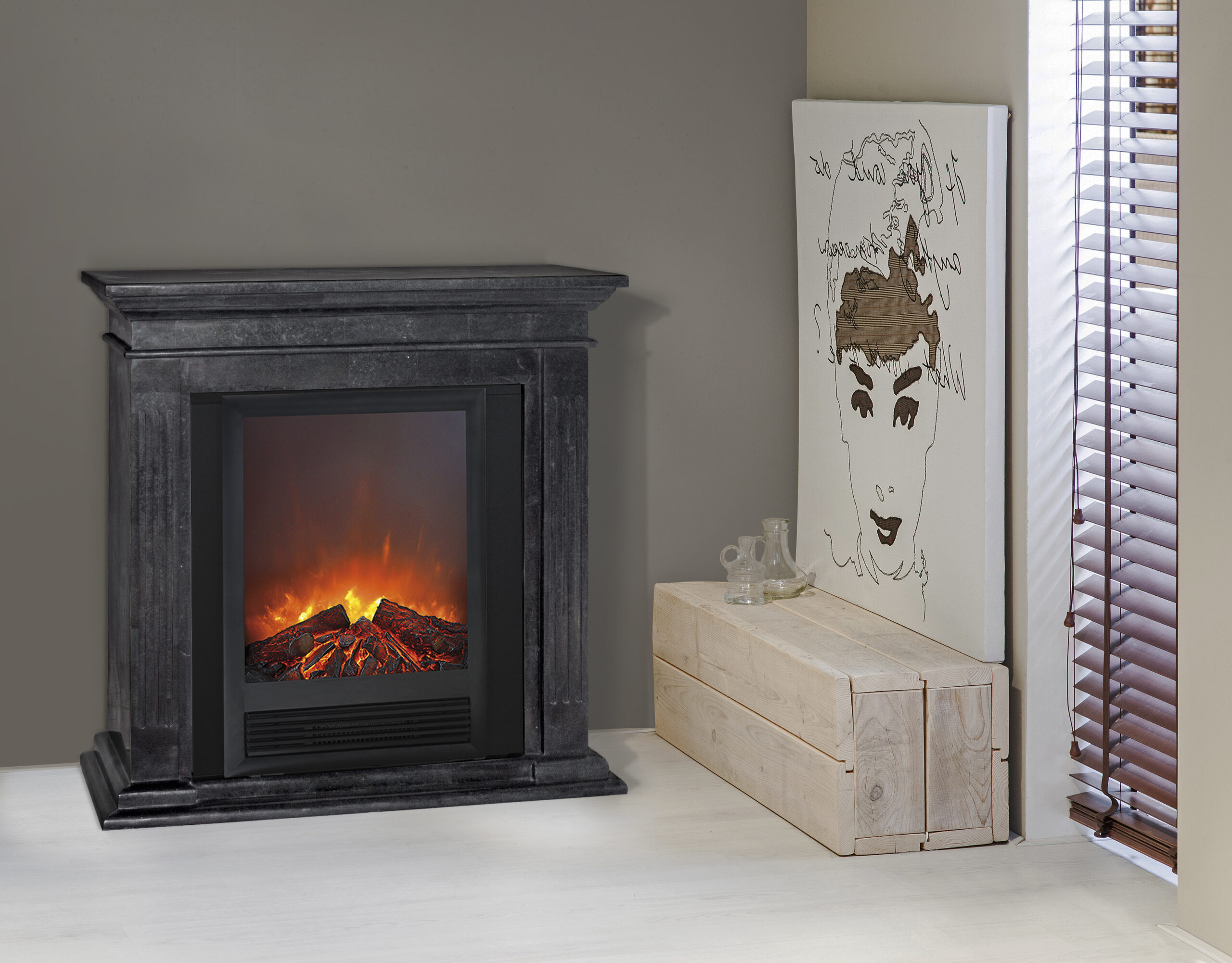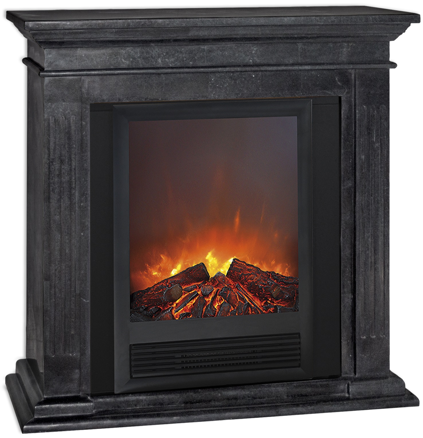 H94,8 x B98 x D37,5cm. Frittstående el-peis med rene linjer. Føydal utsmykking. Farge peis polert sort sten. Innsats sort. Type TFE.