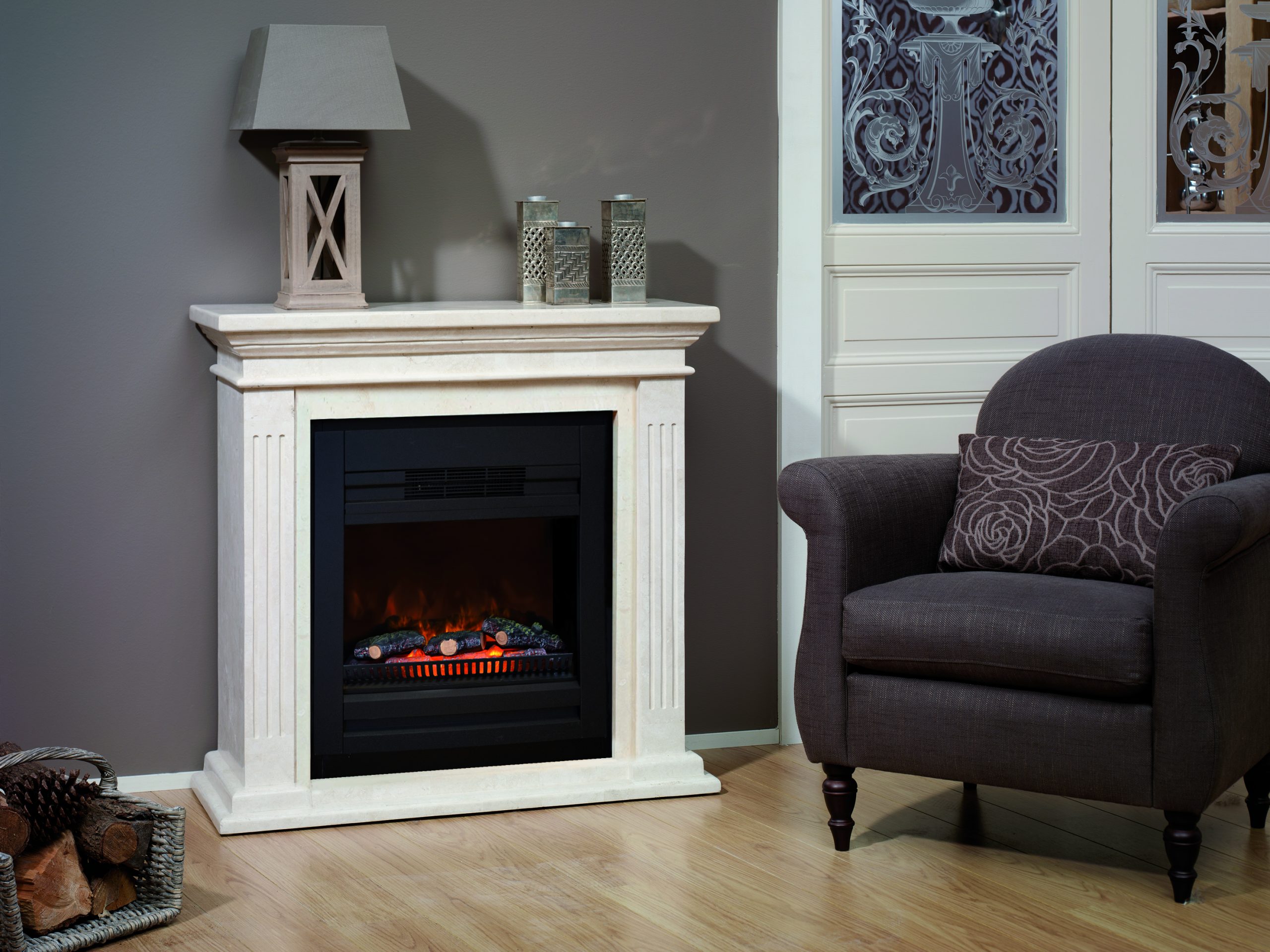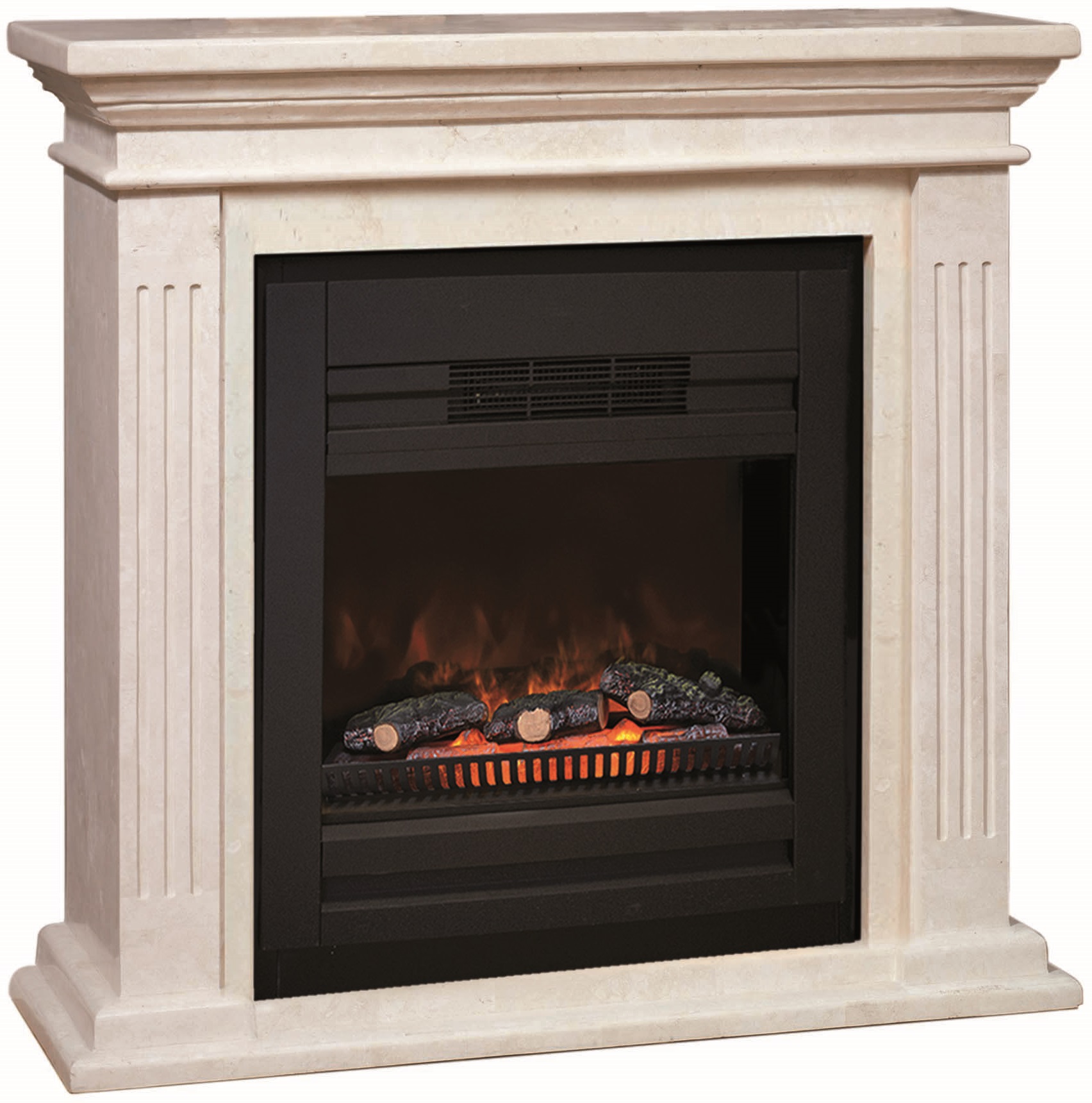 H94,8 x B98 x D37,5cm. Frittstående el-peis med rene linjer. Føydal utsmykking. Farge peis polert offwhite sten. Innsats sort. Type TFM.