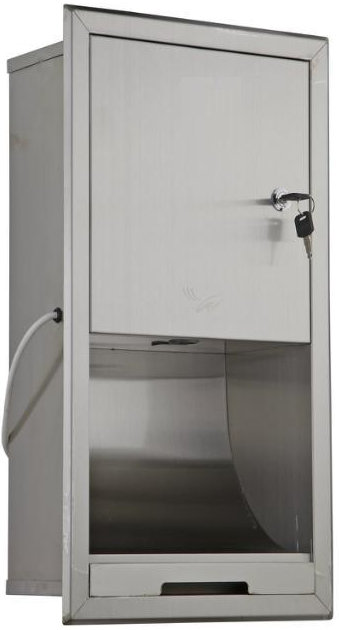 Håndtørker for innfelling i vegg. Svært godt egnet i tøffe miløer. Tørker hendene på 10-12 sekunder. Høyeste grad av vandalsikkerhet. Farge børstet stål. IPX4.