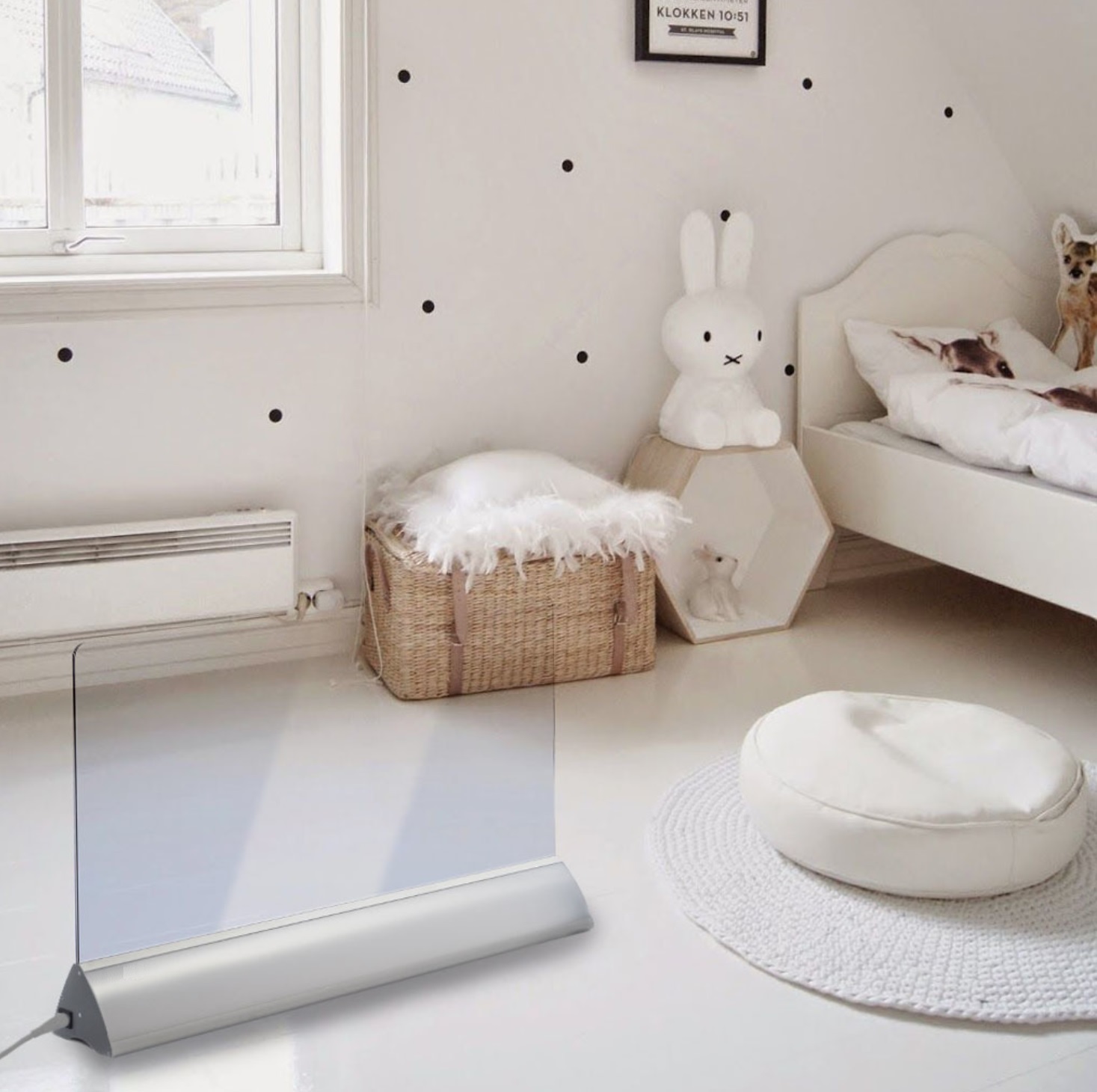 Infrarød, transparent gulvovn med et designriktig utseende. En perfekt varmeløsning for hjem og kontor.